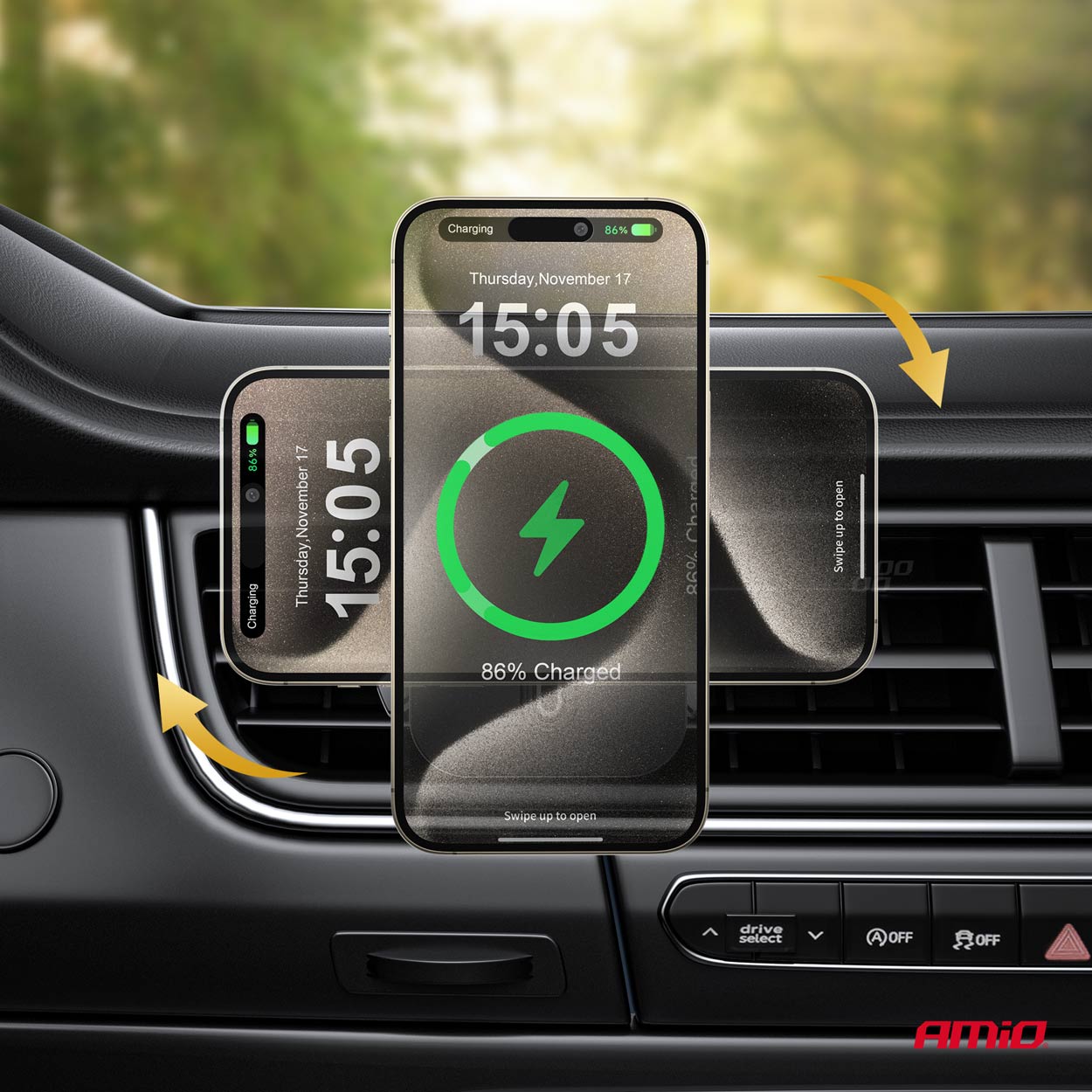 Odkrijte udobje brezžičnega polnjenja v avtomobilu z magnetnim držalom s 15W induktivnim hitrim polnilnikom Qi2. Idealna rešitev za ljudi, ki cenijo udobje, varnost in sodobno tehnologijo! Hitro brezžično polnjenje Qi2 15W: držalo podpira najnovejši standard brezžičnega polnjenja, kar vam omogoča hitro polnjenje pametnega telefona brez potrebe po kablih. Magnetni nosilec: Močni magneti zagotavljajo, da vaš telefon ostane stabilen in varen v katerem koli položaju – tudi med vožnjo po neravnih cestah. Preprosto postavite napravo na držalo in polnjenje se začne samodejno. Univerzalna pritrditev: Držalo je mogoče namestiti tako na prezračevalne odprtine kot na kokpit, kar ponuja fleksibilnost in prilagoditev vsaki notranjosti avtomobila. 360